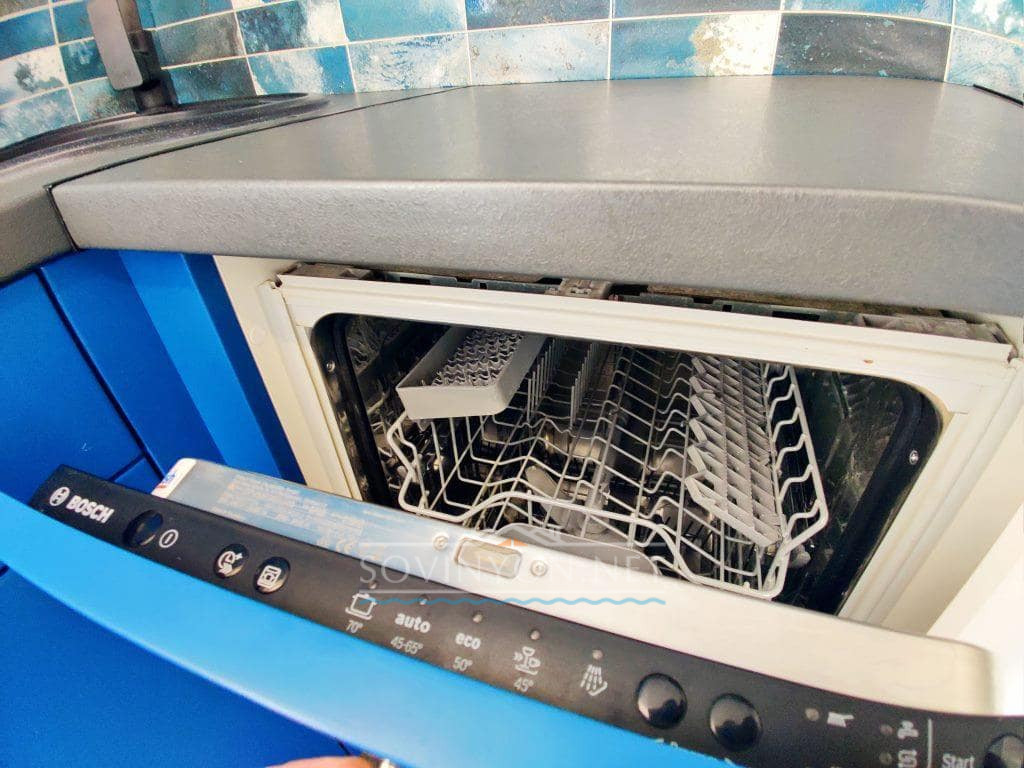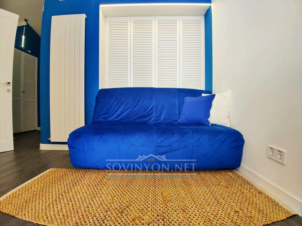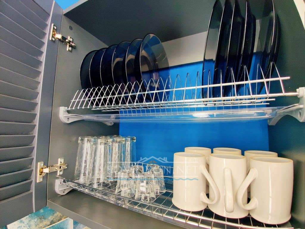 Кухня-гостиная оснащена всем необходимым для приготовления любимых блюд(холодильник, плита, посудомоечная машина, микроволновая печь, чайник, набор посуды и столовых принадлежностей), а также имеется двуспальный раскладной диван, гардеробный шкаф, сейф.
