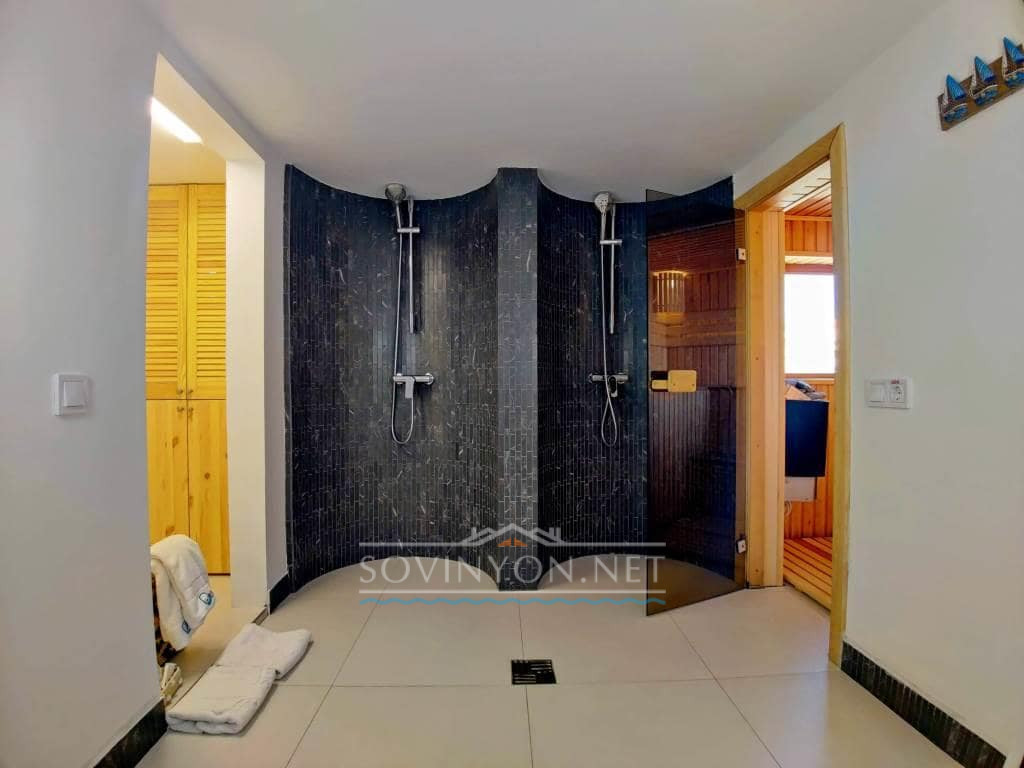 Раздельный санузел с большой душевой и финской сауной оснащённый туалетно-косметическими принадлежностями, полотенцами, халатами, феном и т.д.