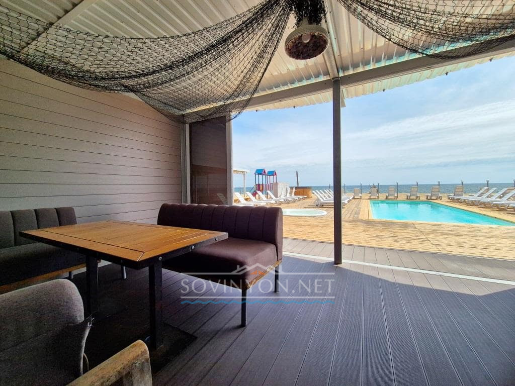 — беседка с видом на море и бассейн оснащена большим обеденным столом, мягкой мебелью и раздвижными панорамными окнами с зеркальной пленкой, сделанные таким образом, что в светлое время суток вас совершенно не видно.