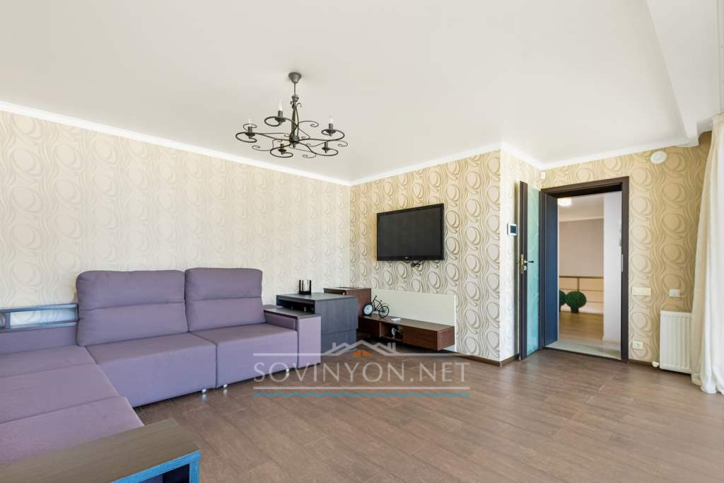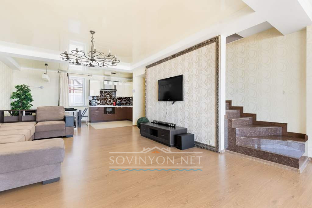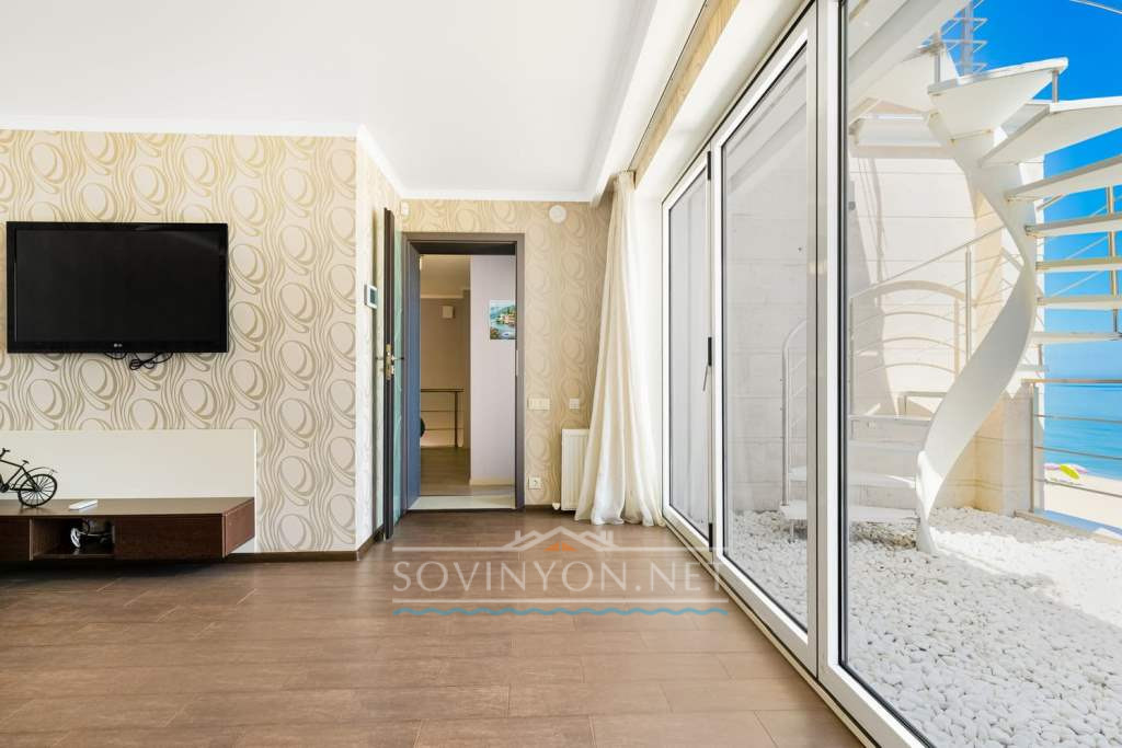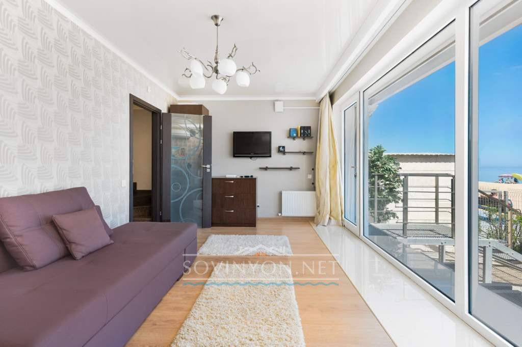 На втором этаже -просторная гостиная с кухней, обеденной зоной, зоной отдыха с удобным раскладным двуспальным диваном, выход на террасу с летней мебелью и шикарным обзором морского побережья.