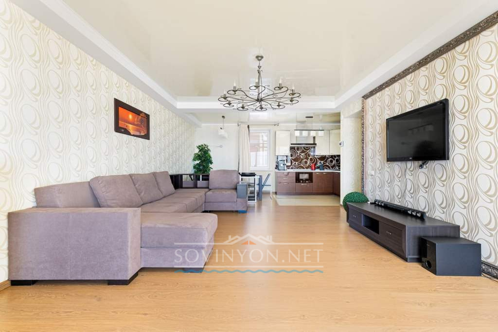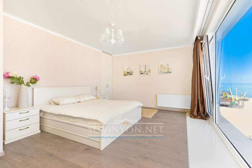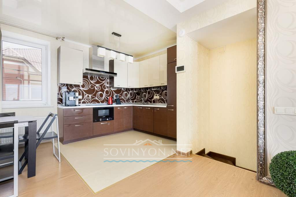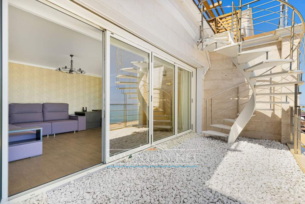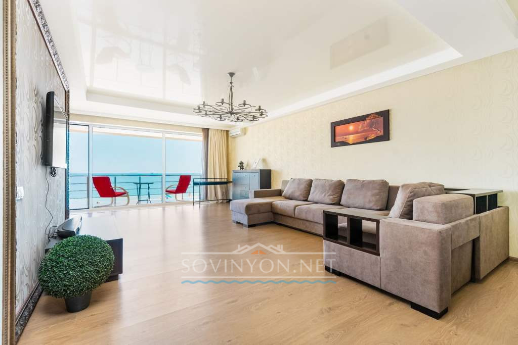 На втором этаже -просторная гостиная с кухней, обеденной зоной, зоной отдыха с удобным раскладным двуспальным диваном, выход на террасу с летней мебелью и шикарным обзором морского побережья.