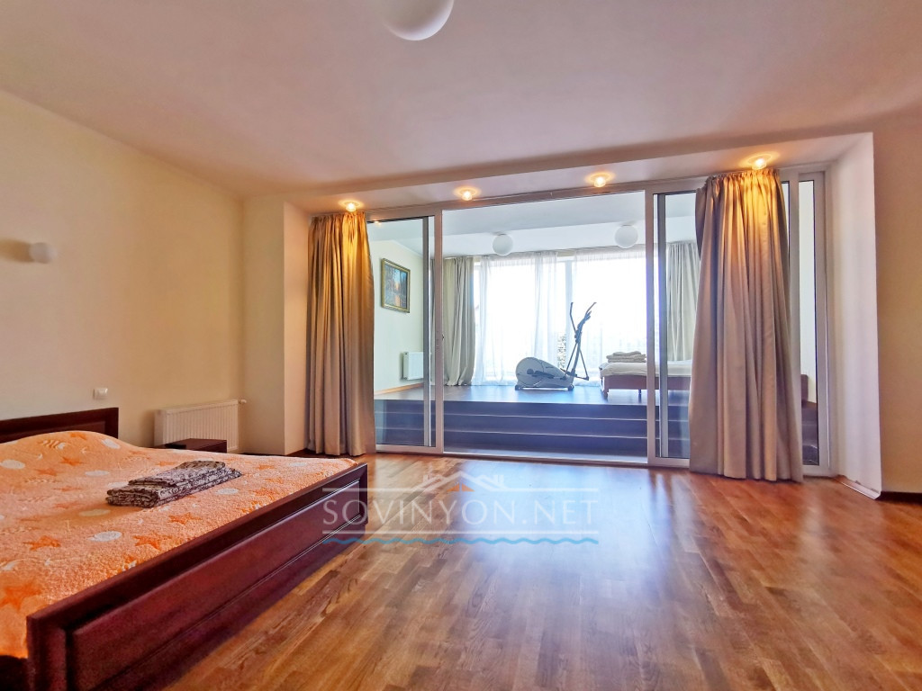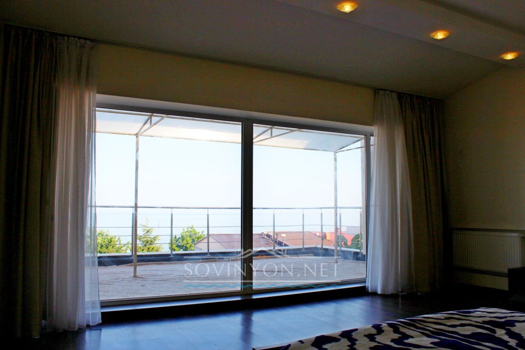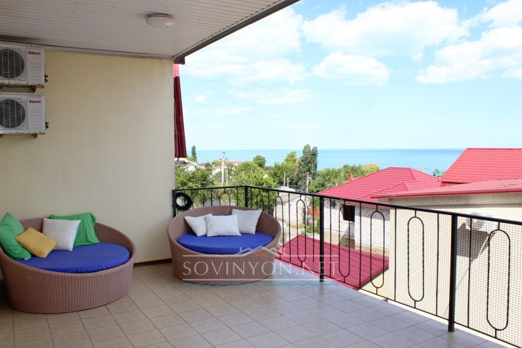 3 этаж просторная комната с двуспальным диваном, и большая спальня с двуспальной кроватью, кондиционером и своим выходом на шикарную террасу с видом на море!!!