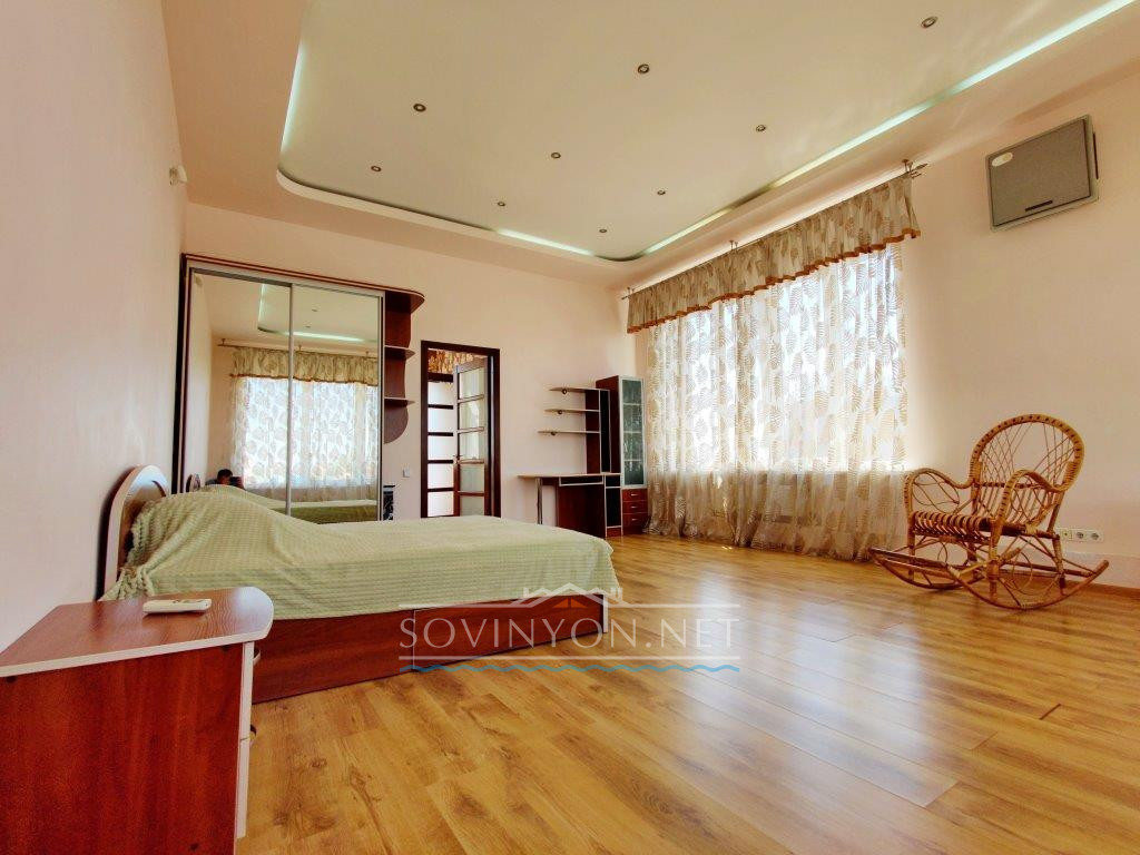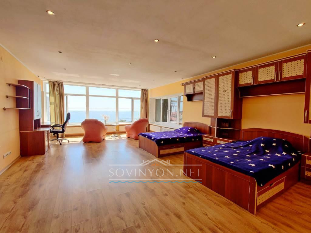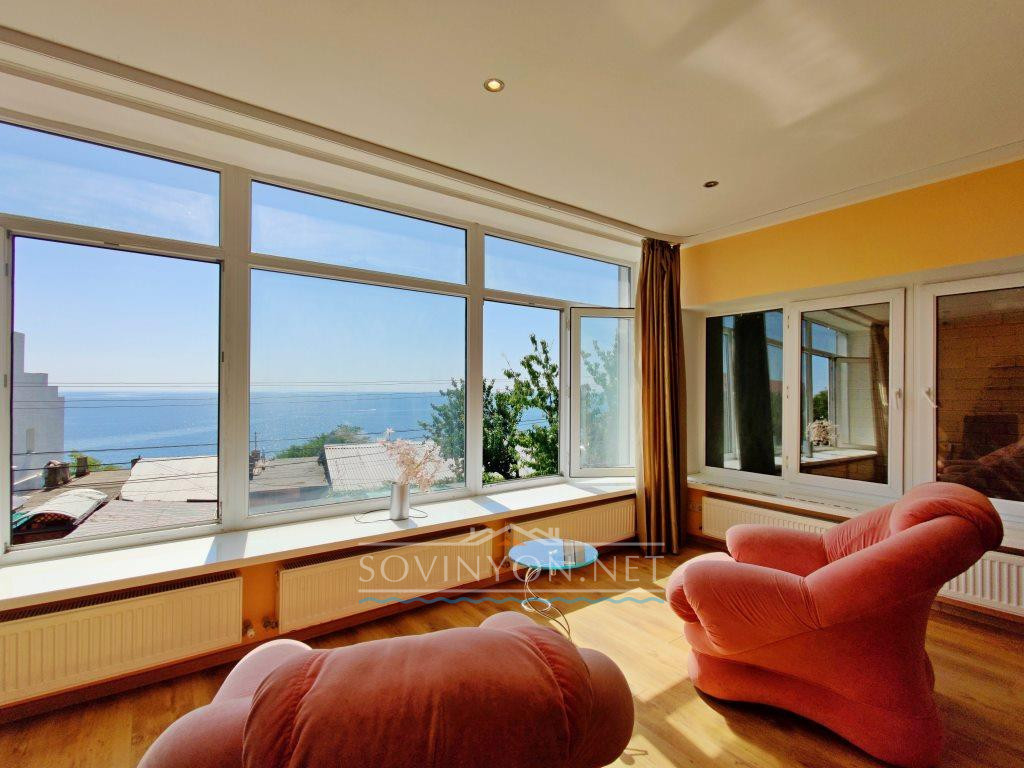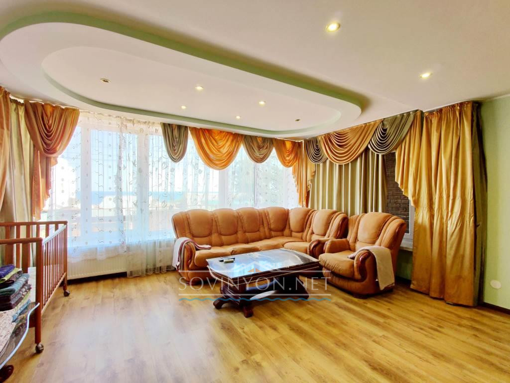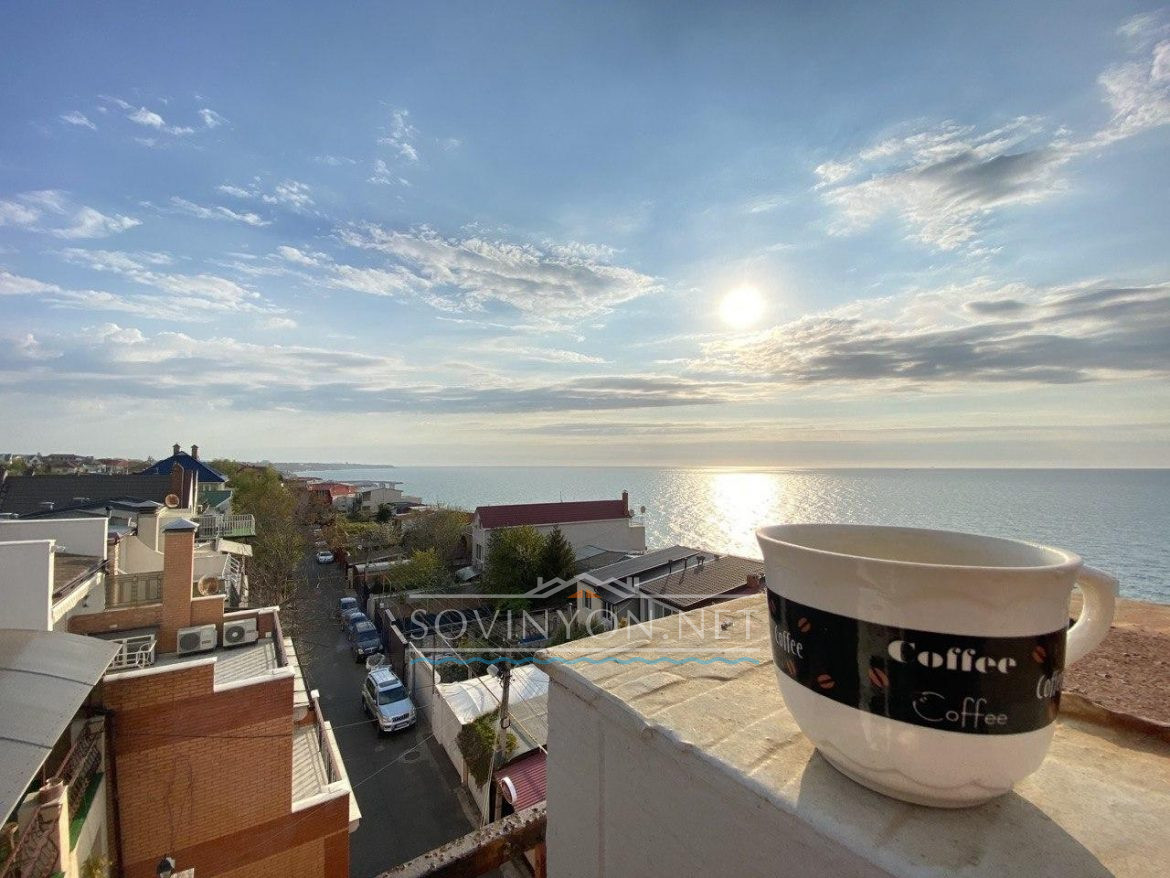 В доме 4 этажа, кухня-гостиная площадью 80 квадратных метров, четыре санузла, пять просторных полноценных спален и шикарная терраса с которой открывается исключительный вид: одновременно видно мыс Большой фонтан(район Золотого Берега) и высотные дома Черноморска. Панорама на море открывается со всех этажей!