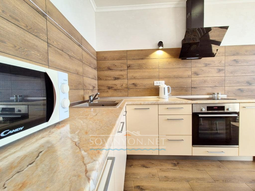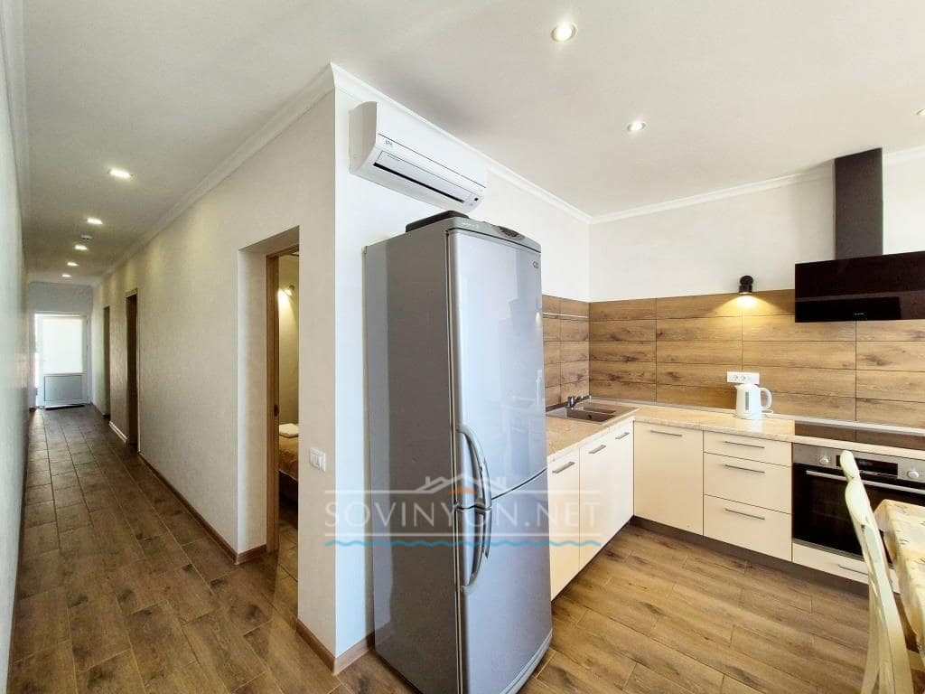 • кухня со всей необходимым(холодильник, чайник, варочная поверхность, духовой шкаф, микроволновая печь, различная посуда), обеденный уголок с видом на море, ротанговая мебель, кондиционер, телевизор со smart TV