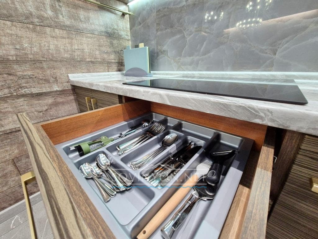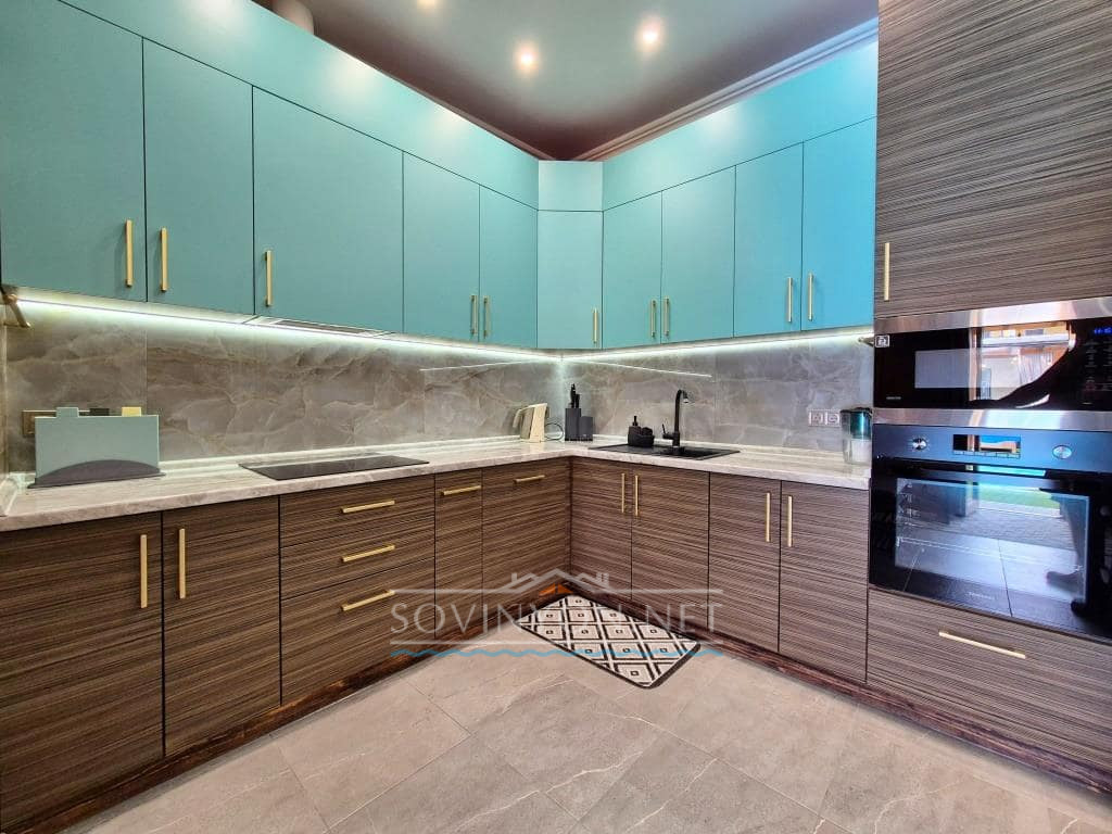 — Кухня оснащённая всем необходимым(холодильник, плита, кофемашина, микроволновая печь, посудомоечная машина, чайник, полный набор столовой и кухонной посуды)