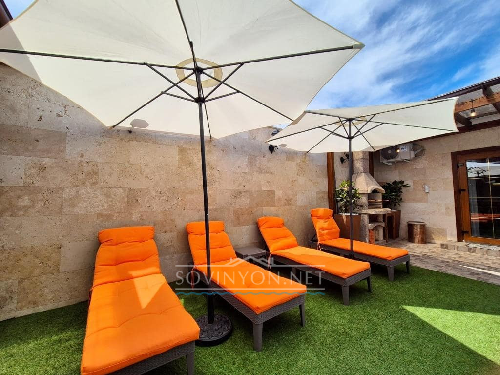 — Удобные шезлонги с матрасами и зонтами