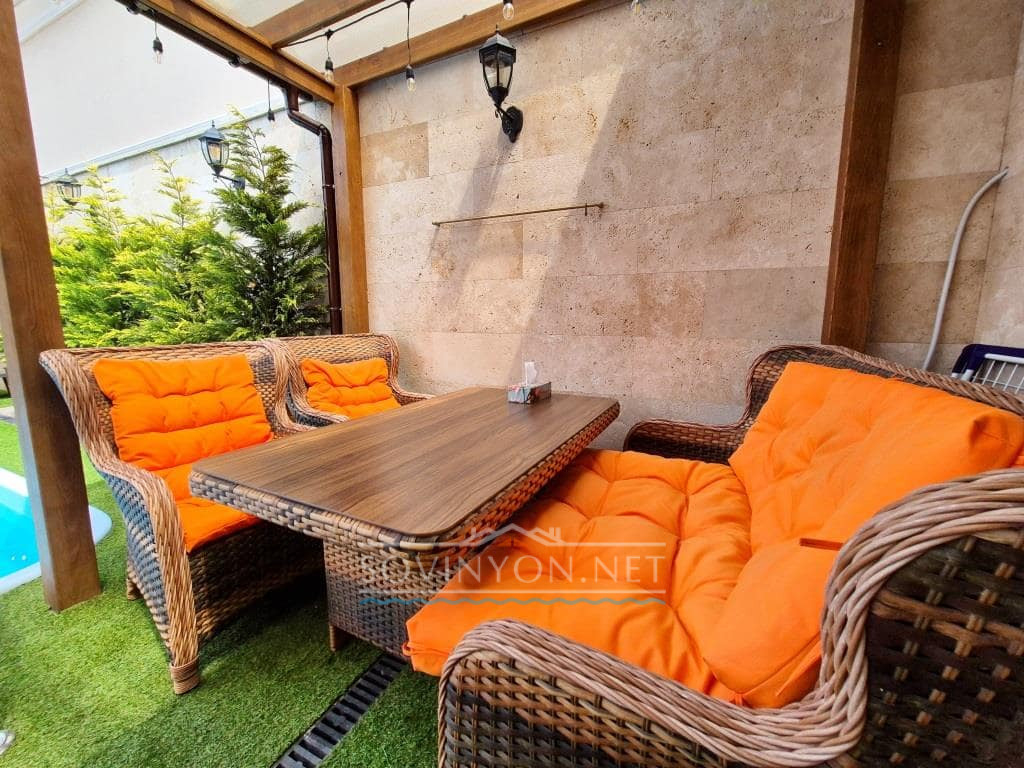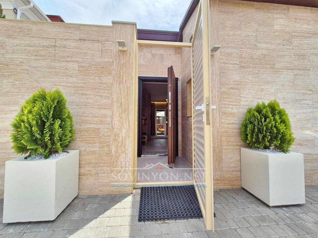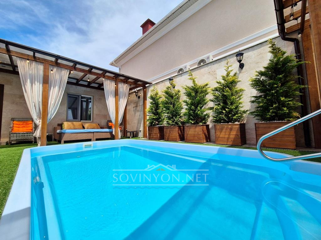 Современный и стильный дом построен в одном уровне, что очень удобно для отдыха с детьми да и просто для себя)