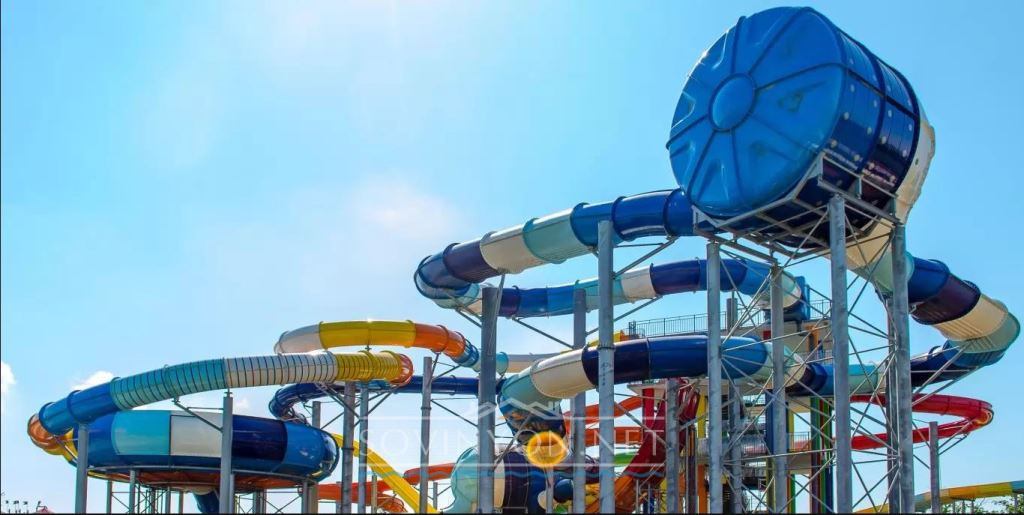 - На территории аквапарка оборудованы 27 водных аттракционов, каждый из которых имеет несколько уровней сложности, 6 бассейнов, игровой и пляжный комплекс.