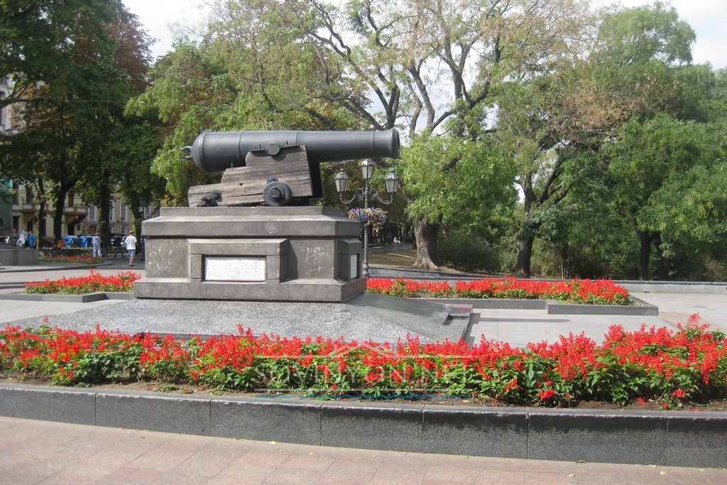 Здесь же, на Думской, находится еще одна известная историческая достопримечательность – пушка, дуло которой повернуто в сторону моря. Данный экспонат является оригинальной пушкой с английского фрегата «Тигр», который был потоплен в районе Аркадии в 1854 году, в ходе Крымской войны. «Тигр» обстреливал Одессу ядрами, которые свистели по всей центральной части города, свидетельства которых можно найти и у памятника Дюка – шальное ядро, обидевшее известного француза, оставлено на память и до сих пор лежит у его ног.