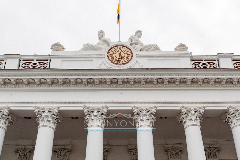 Что самое интересное, каждые полчаса из здания, а точнее из скульптурной группы «День и Ночь», которая установлена над колоннадой в форме двух женских фигур, символизирующих неумолимое течение времени, можно услышать официальный гимн города – мелодию «Песни об Одессе» из оперетты «Белая акация» Исаака Дунаевского 1955 года. А вот целый куплет «И в сердце моем, ты всюду со мной, Одесса — мой город родной!» воспроизводится каждый час.