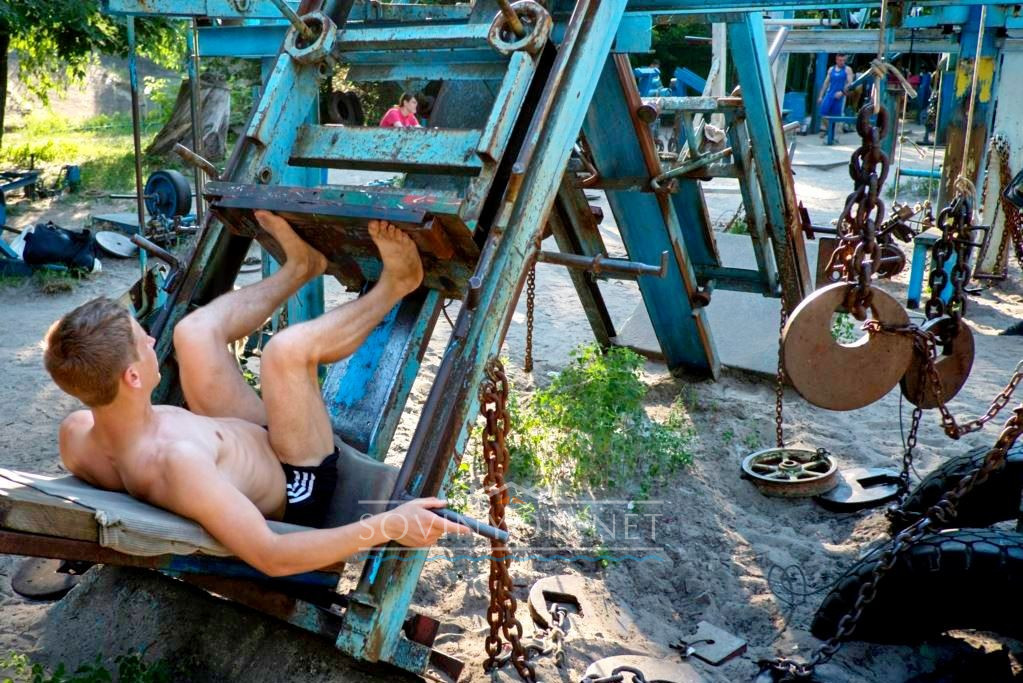Или как вам тренажер в виде рычагов, привязанных к кардану и кабине от КАМАЗа, рассчитанные на проработку мышц спины?