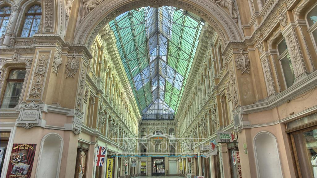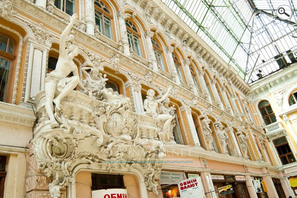 Здание Пассажа пленяет пышностью: декоративные античные скульптуры, стены с лепниной стиля барокко, стрелянный купол атриума. В архитектуре удивительным образом с барокко переплелись классика и модерн. Некоторые искусствоведы остроумно называют здание Пассажа пирожным со взбитыми в пышную пену белками. Главной особенностью считают атриум (внутренний дворик) со стеклянной крышей, в нём разместился торговый комплекс.