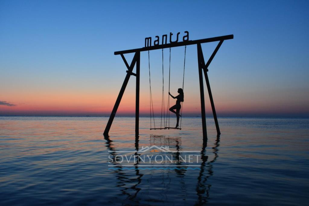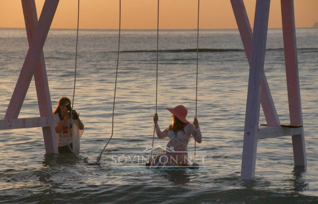 Отличное место для романтических фотосессий: качели в воде, недалеко от берега, но при определённом ракурсе можно создать впечатление полного уединения — просто качели и море.