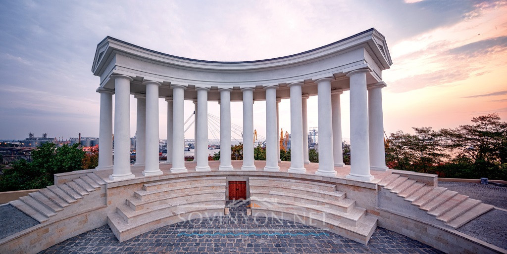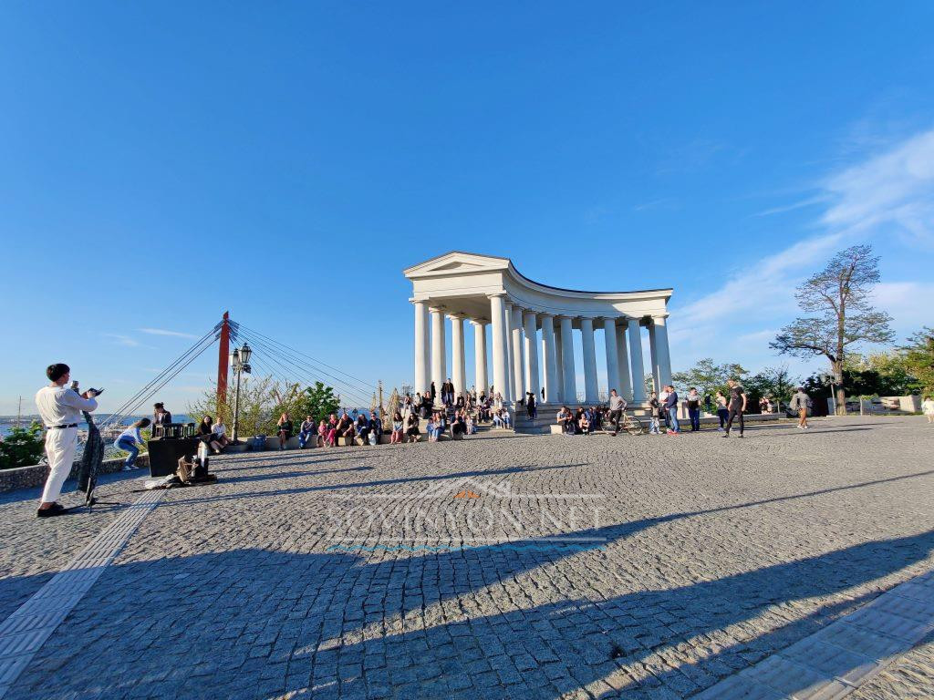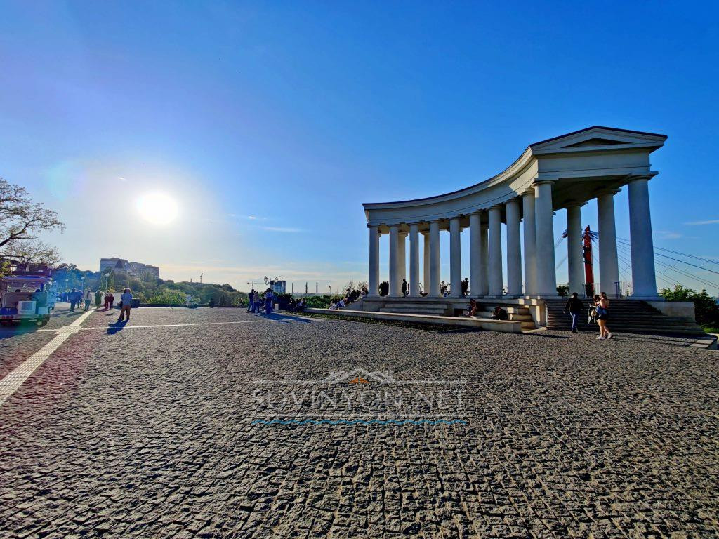 Когда-то она была частью оранжереи дворца графа Воронцова, и генерал-губернатор с утренней чашкой чаю отсюда лично наблюдал за входящими в порт судами и их разгрузкой. О колоннаде рассказывают несколько легенд: о двери в её основании, ведущую в катакомбы, где прятали свой товар торговцы людьми; о влюблённых, оставляющих письма друг другу в одной из колонн. Говорят и о тайных встречах с графини с Пушкиным в оранжерее. Как бы то ни было, колоннада популярна и сегодня — тут фотографируются влюблённые и молодожёны, иностранные туристы и одесситы. Особенно хороши снимки на рассвете. Пробуйте!