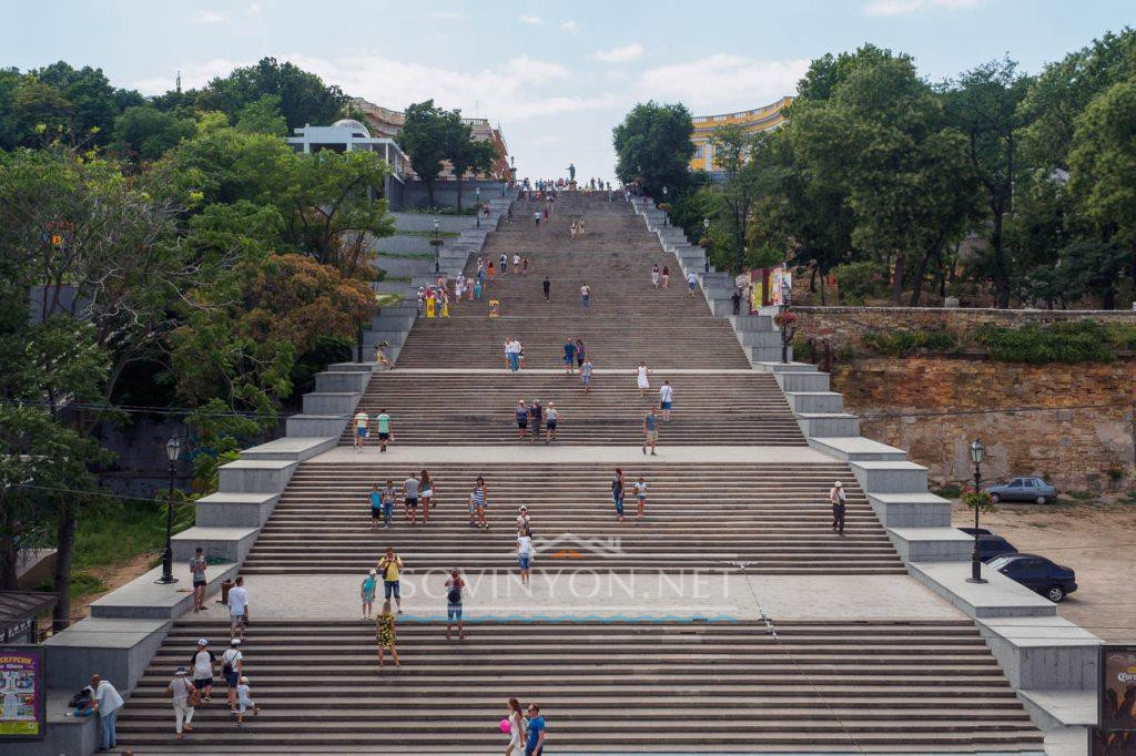 Ступенек поначалу было ровно 200 — архитектор Боффо спроектировал их так, чтобы у нижних плескалось море. Через какое-то время море «отступило», 8 нижних ступенек закатали под асфальт проезжей части. Конечно, жаль — представляете, какие могли быть снимки? Но и сейчас — прекрасный вид на порт, яхт-клуб, четырёхзвёздочную «Одессу». Направо Стамбульский парк, налево Греческий — только и знай, что фотографируйся. Наверняка — ни одного испорченного кадра. Единственная проблема: улучить момент, когда лестница пуста, практически невозможно.