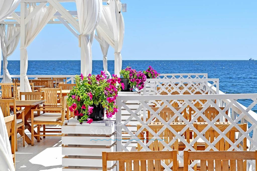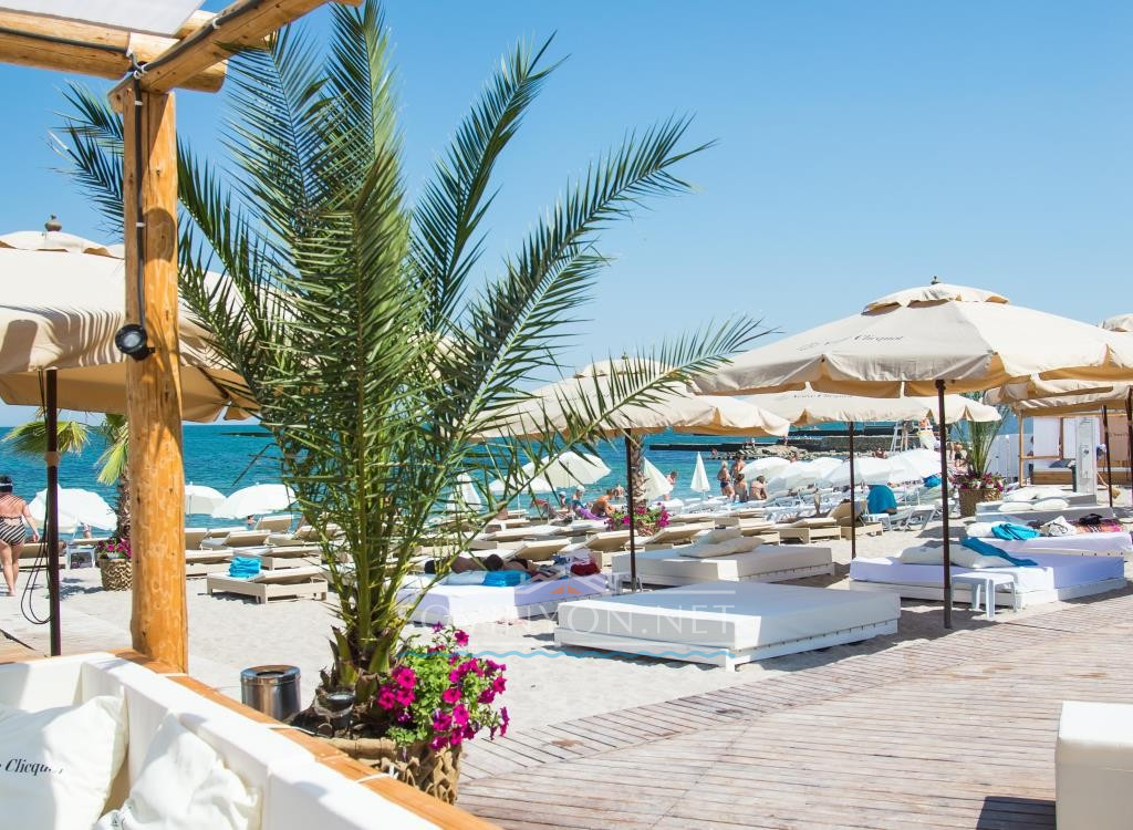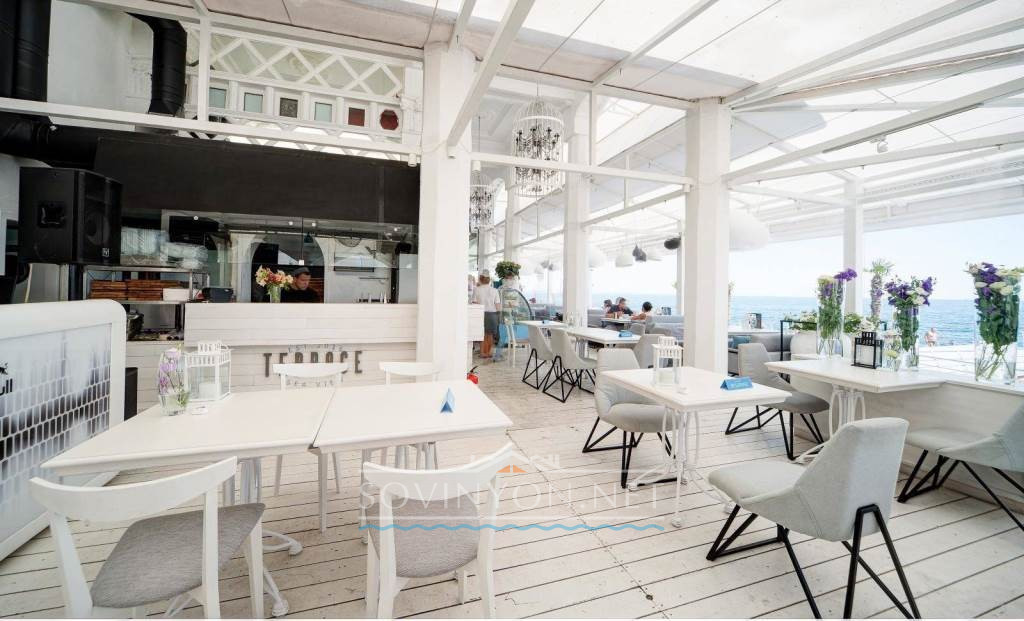 «Ривьера» — это небольшой пляж, ночной клуб и ресторан на воде, идти к которому нужно по узкому пирсу. Стильный интерьер — с летящими белоснежными занавесками, изящной мебелью и посудой, создаёт атмосферу роскоши и беззаботного отдыха и удивительным образом сочетается с морскими пейзажами и городскими видами.