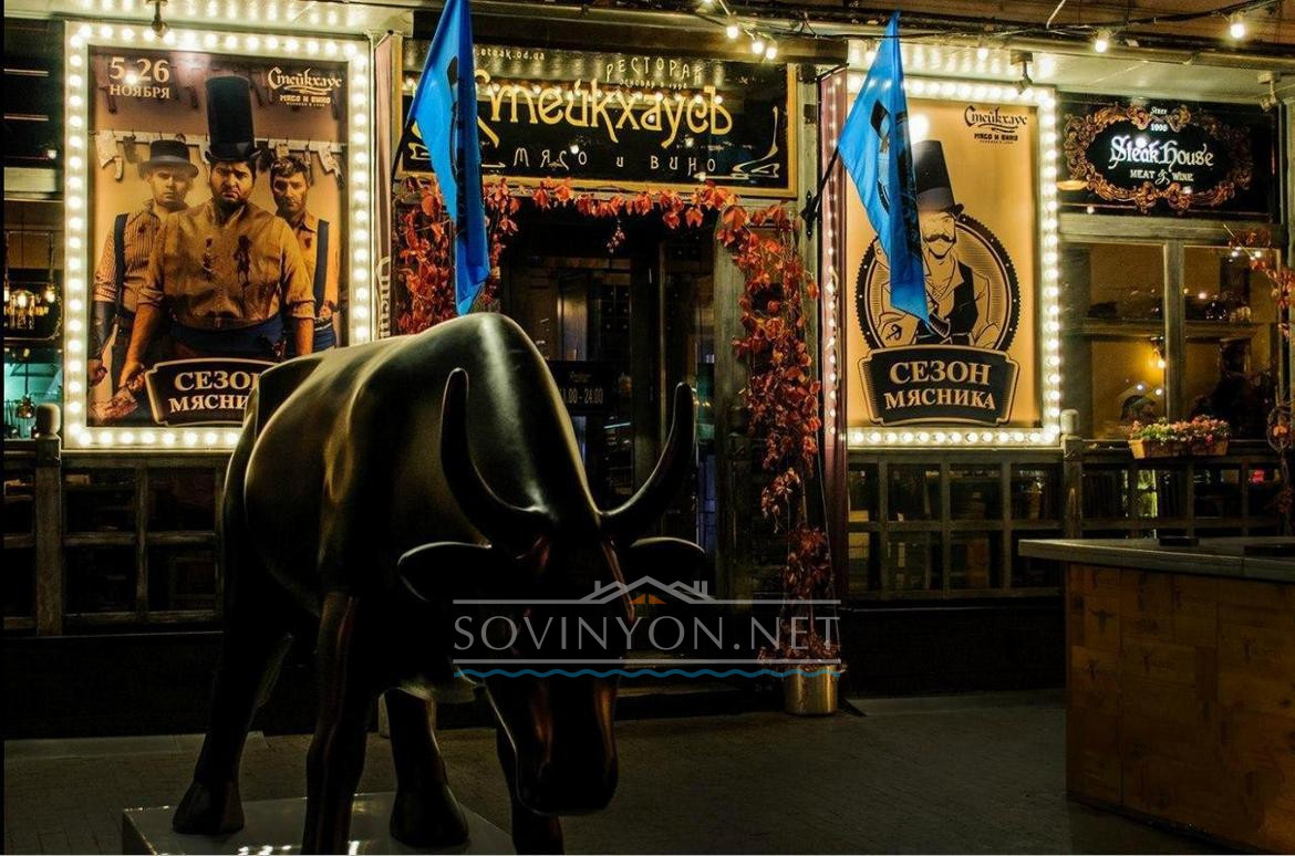 Конечно, на Дерибасовской около Горсада— а где ещё находиться самому известному ресторану для мясоедов и не только? Мимо не пройдёте — у входа стоит корова в натуральную величину. Обстановка внутри чуть хулиганская и напоминает о вестернах, ковбоях, Диком Западе. Двухуровневый зал с зональным распределением, минимум декора, на столах ароматные травки в подставке-кости, потёртые, как в приличном салуне, деревянные стулья и открытая гриль-кухня, позволяющая пронаблюдать весь процесс приготовления выбранного куска мяса в хоспере на натуральных углях.