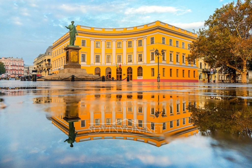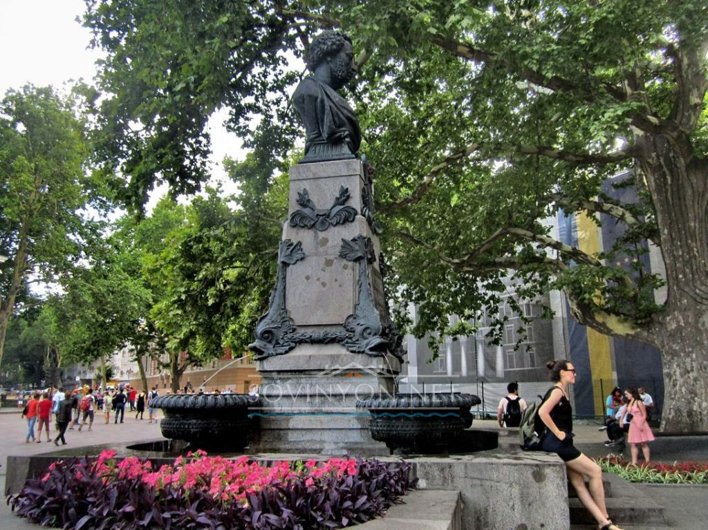 Пренебрежительно отвернувшийся от здания мэрии кудрявый Пушкин с полуулыбкой рассматривает одесситов и гостей города, гуляющих по Приморскому бульвару. Это первый в Украине памятник великому русскому поэту, в Российской империи он был вторым, возведён к полувековой годовщине смерти.