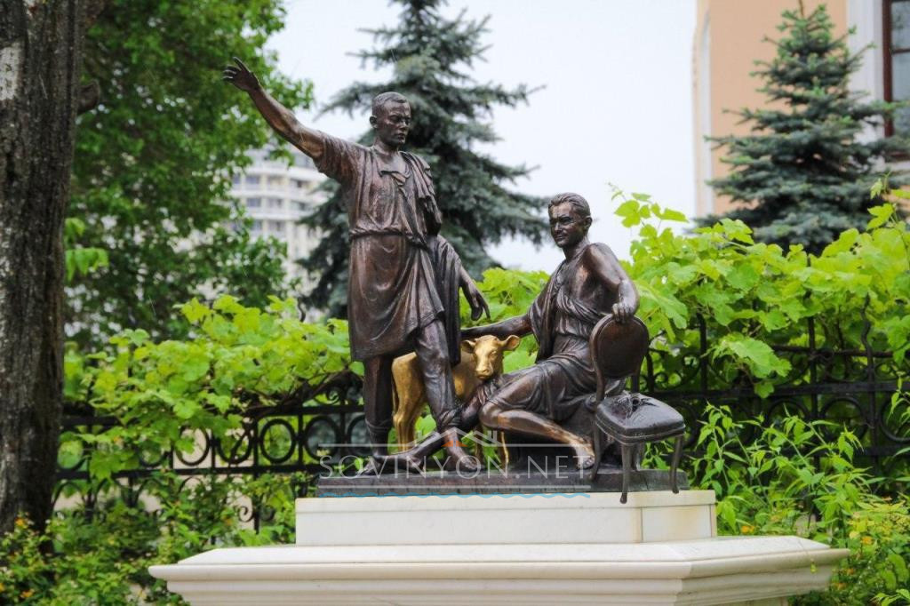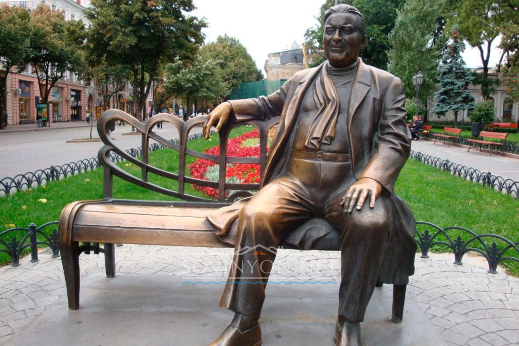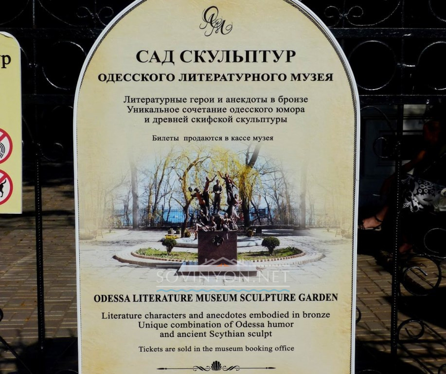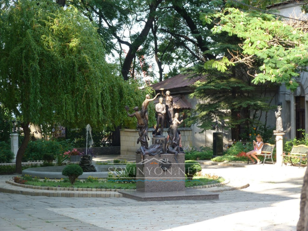В типичном итальянском дворике с клумбами и фонтаном, рядом с тысячелетними половецкими бабами бронзовеет Жванецкий, улыбается Владимир Высоцкий, а Николай Гоголь соседствует с Ильфом и Петровым, как и литературные персонажи с реальными героями нашего времени.