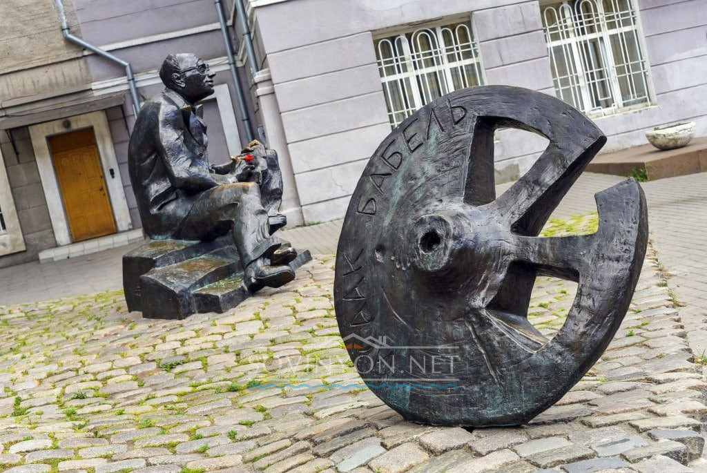 Там во дворе бронзовый Исаак Эммануилович сидит на ступеньках (как знать — может, Потёмкинской лестницы) и придумывает очередную главу «Одесских рассказов» или продолжение приключений на буйную голову Бенциона Менделевича Крика. Рядом на реставрированной мостовой — колесо телеги застыло в полёте, как остановившееся время.