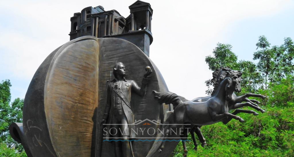 …На невысоком постаменте — впряжённый в тройку гнедых бронзовый и уже наполовину очищенный апельсин с парой выпавших долек, внутри — фигура падкого до апельсинов Павла I. Сверху на апельсине корона из городских «визиток» — Оперный, колоннада Воронцовского дворца и Спасо-Преображенский собор.