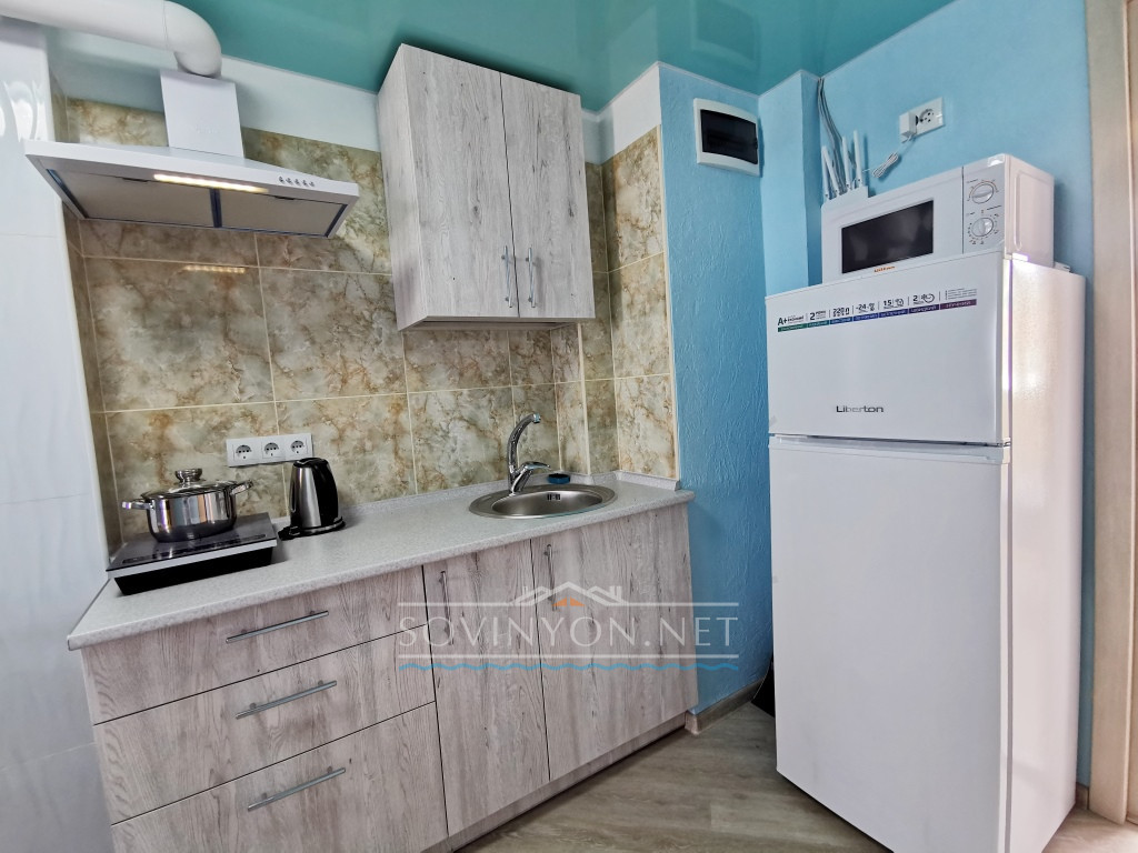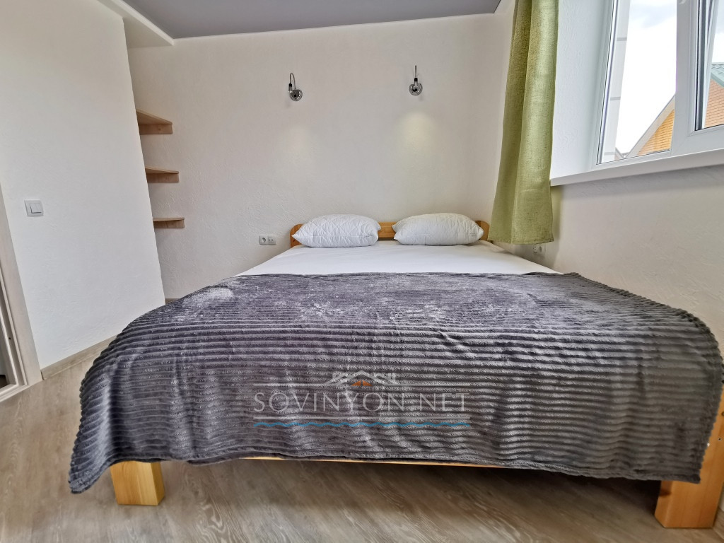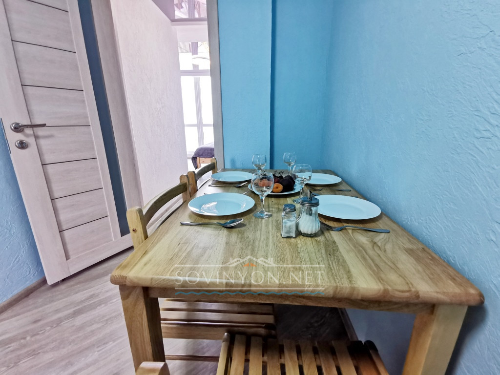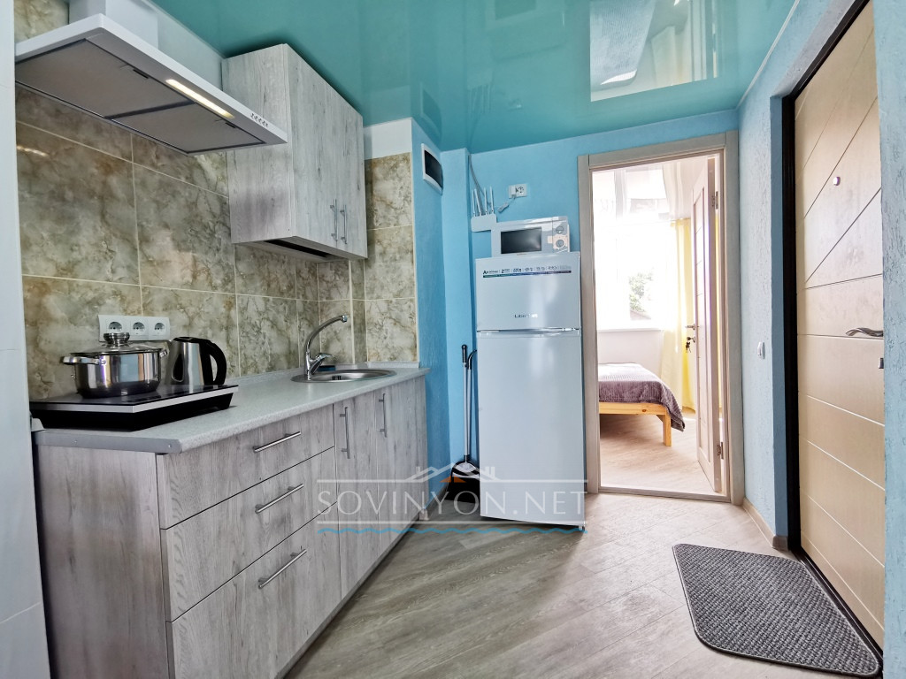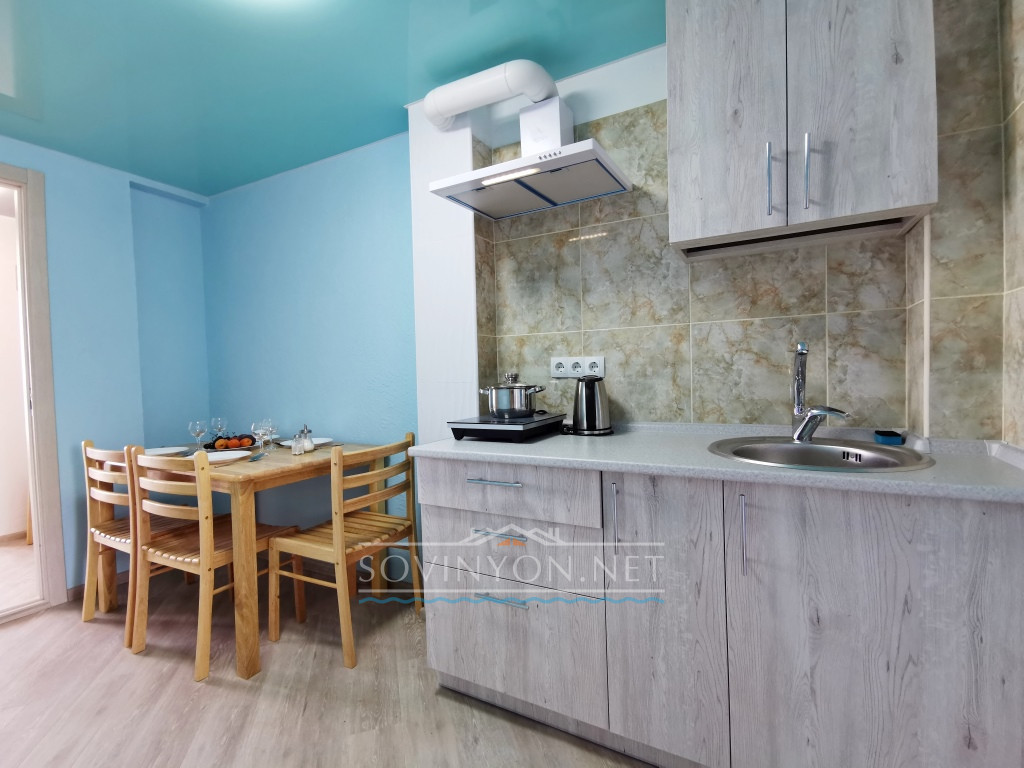 Одна зі спалень має панорамні вікна з видом на море. друга спальня має вікна на задній двір. Між спальнями знаходиться міні-кухня облаштована всім необхідним (холодильник, чайник, плита, мікрохвильова піч, каструлі, посуд та інший інвентар). У кожних апартаментах є додаткове спальне місце (крісло-ліжко)