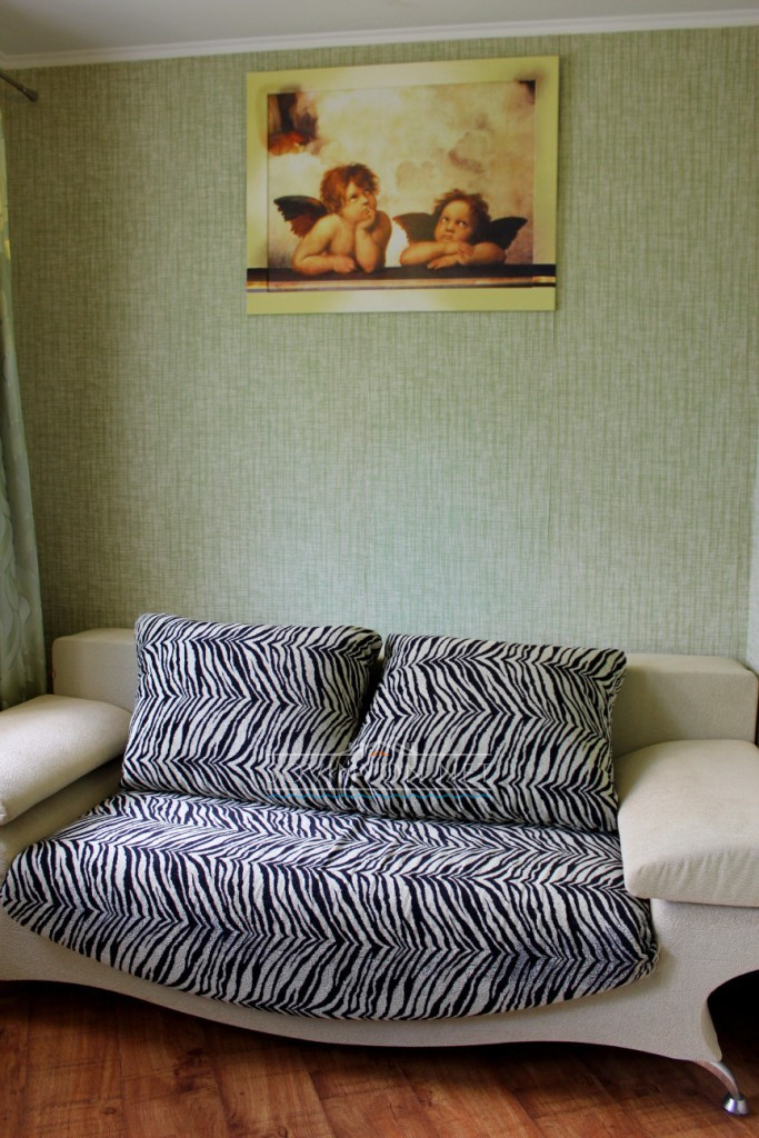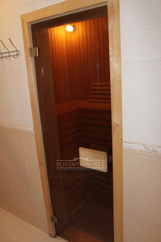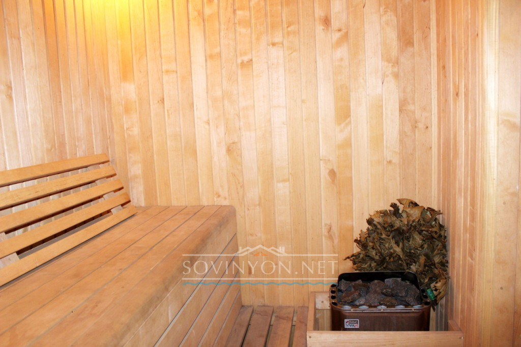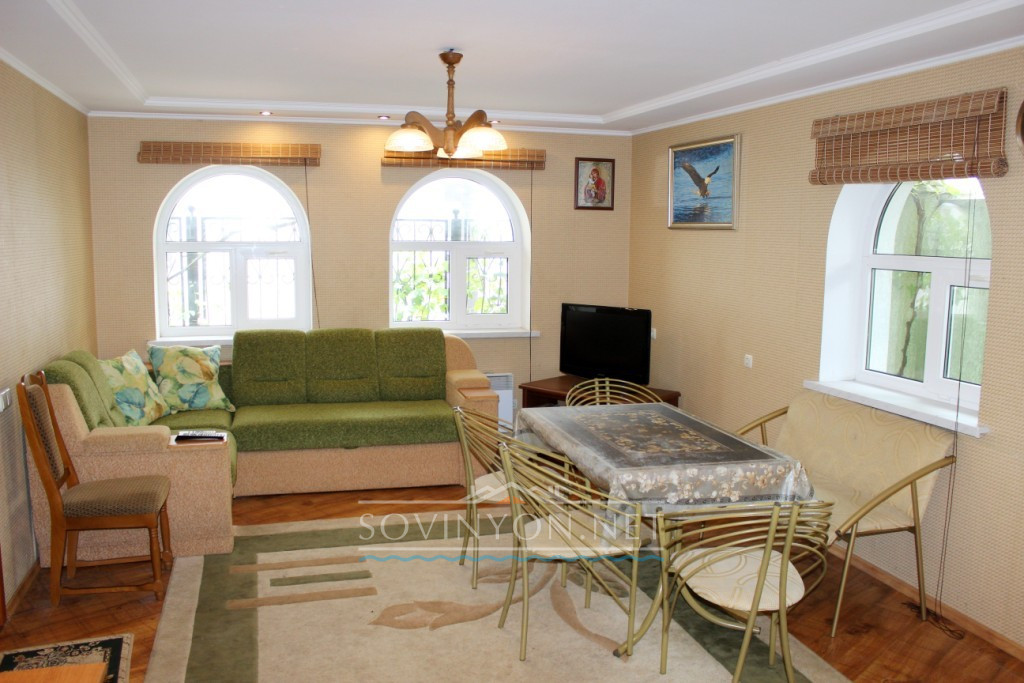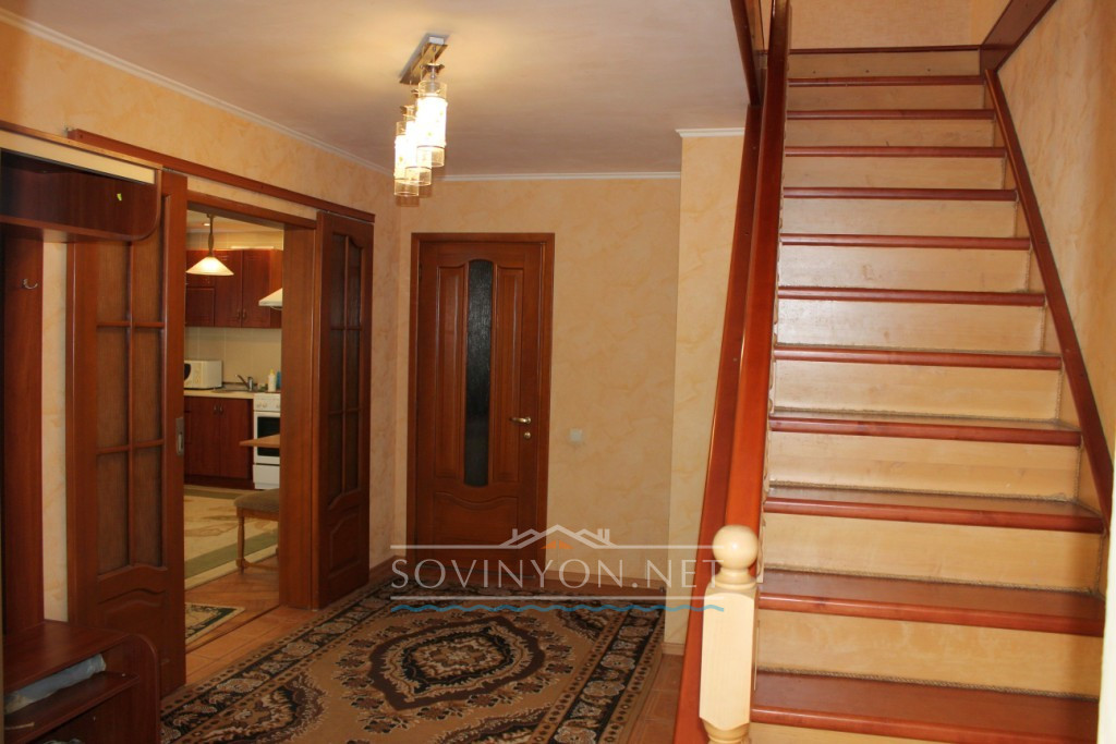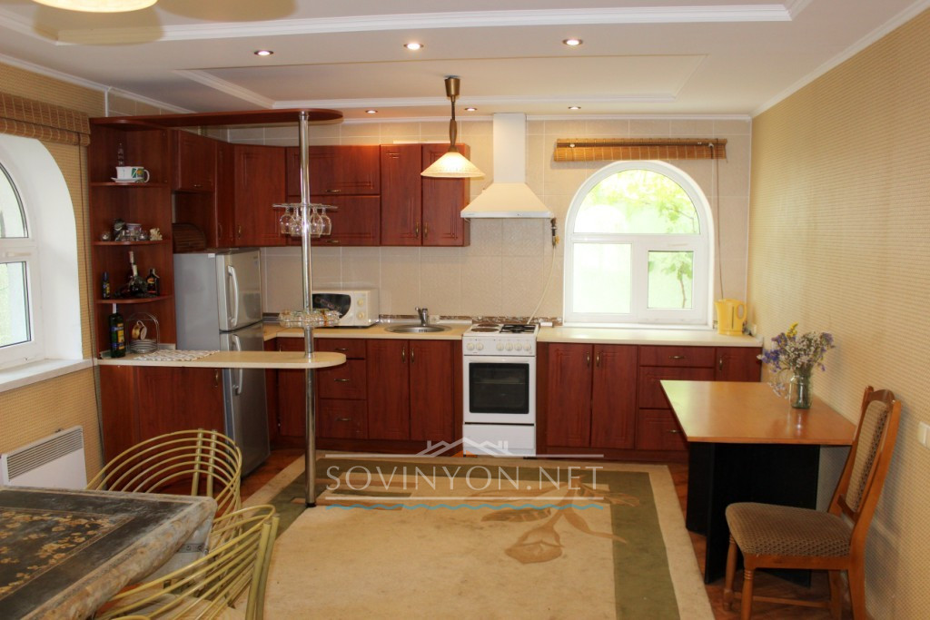 • На першому поверсі кухня студія і простора вітальня з великим двоспальним диваном. Кухня оснащена всім необхідним: холодильник, чайник, газова плита і електро плита, духова піч, мікрохвильова піч, повний набір посуду, пральна машинка. Так само на першому поверсі знаходиться роздільний санвузол і сауна.
